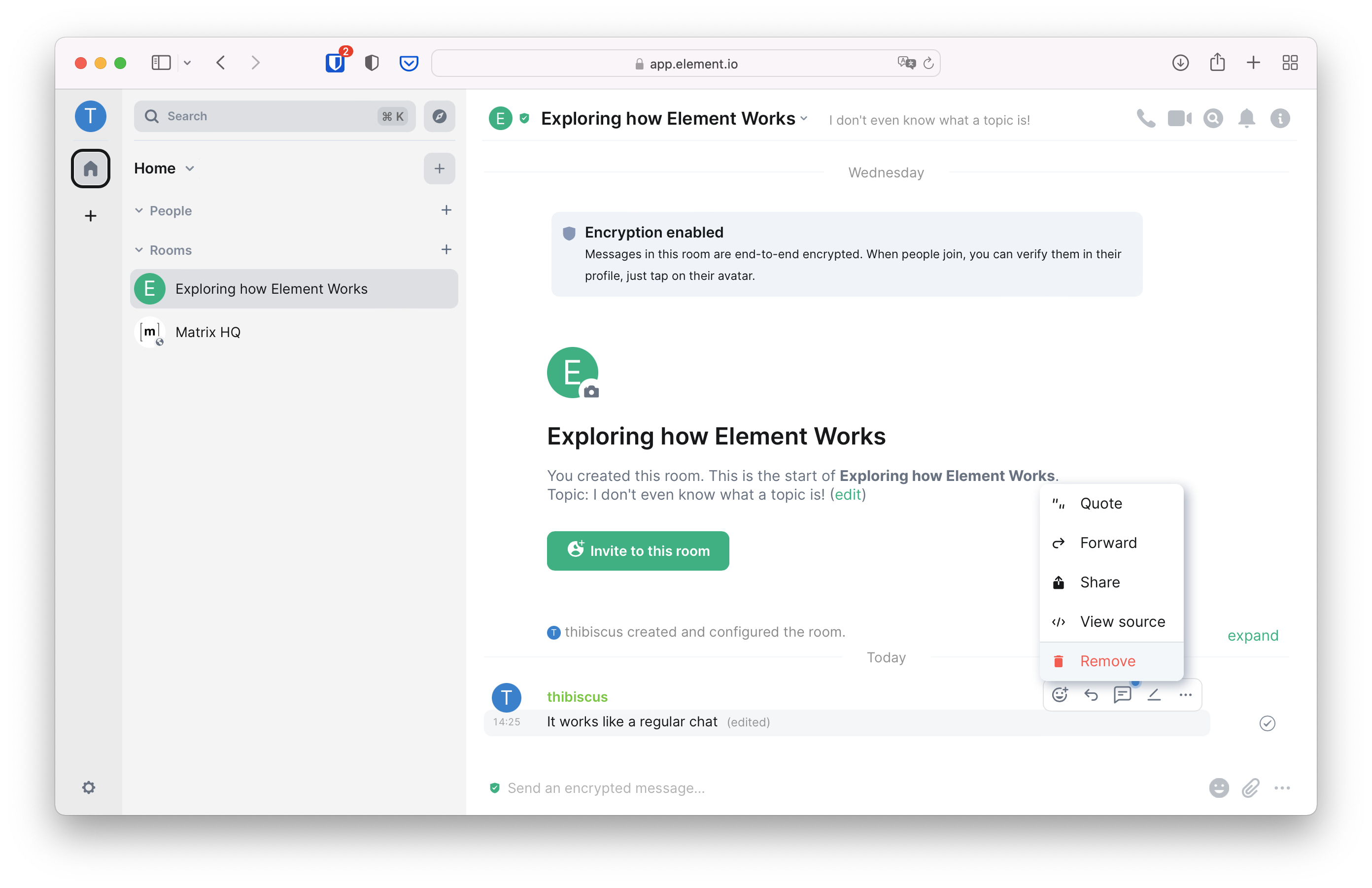Voilà, you're in your own group chat! In the Matrix jargon, chats are called rooms. Let's give it a try immediately and type a message, then either press the return key or click on the send button.