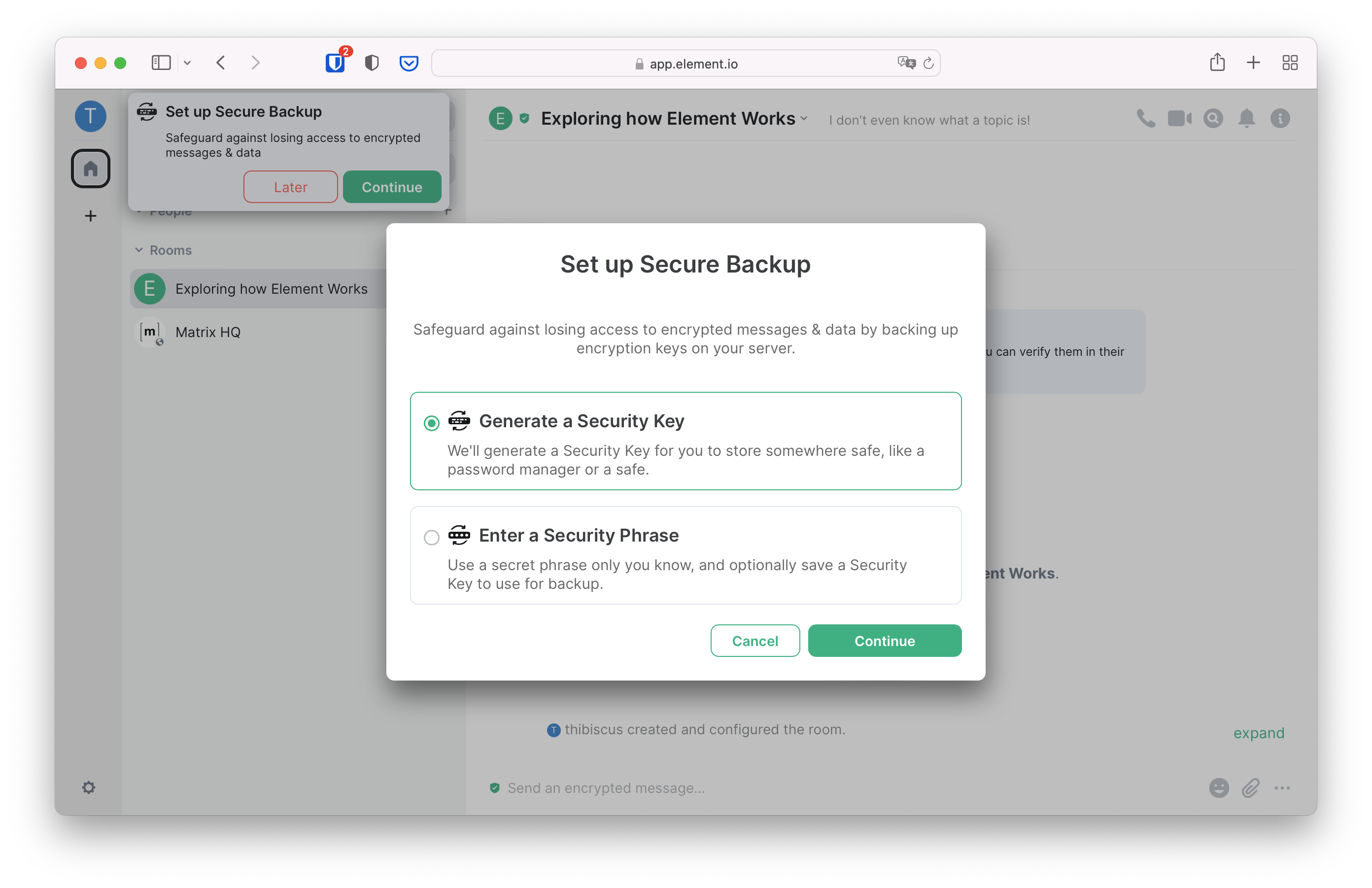 This secret piece of information used to decrypt messages is stored on a digital safe. The key unlocking that digital safe is called a Security Key. Element walks you through the set-up of this digital safe called "Secure Backup" when you click on Continue on the top-left pop-up.